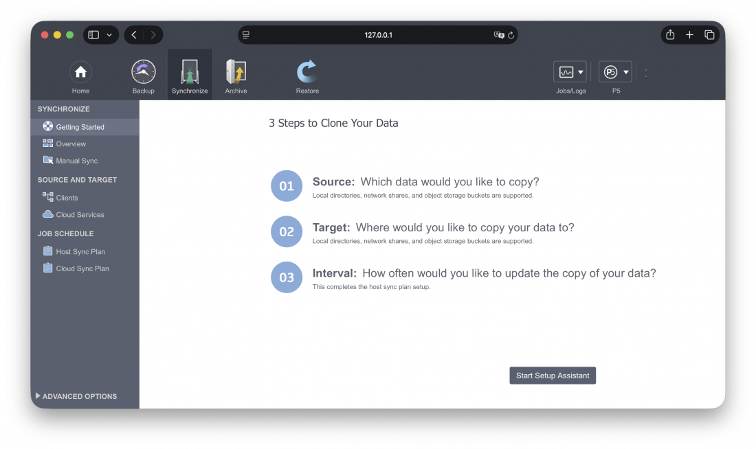 Archiware P5 Synchronize wird im Browser konfiguriert und überwacht und bietet unkomplizierte Funktionalität selbst für höchste Ansprüche - durch command line ausgelöste Sync-Prozesse werden überflüssig.
