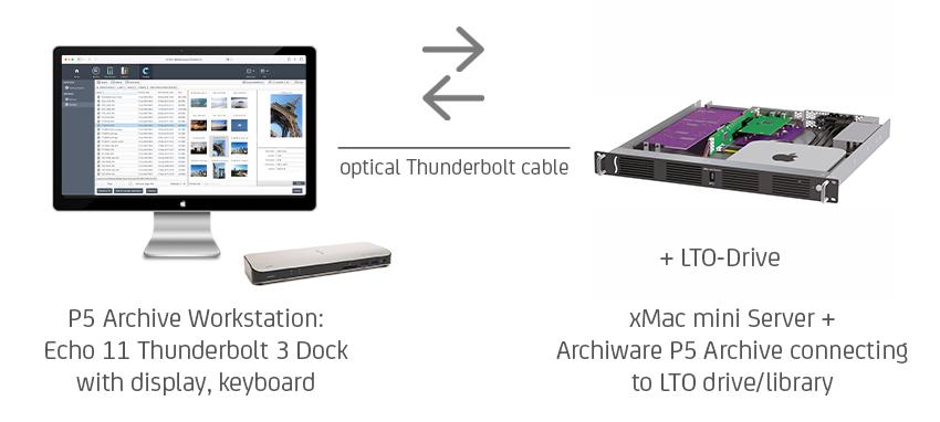 Daran können einfach Bildschirm, Tastatur, Mouse und andere Geräte angeschlossen werden – so entsteht der Arbeitsplatz überall. Ein LTO-Laufwerk oder eine Library kann über SAS, FC oder Thunderbolt angeschlossen und im Rack montiert werden.