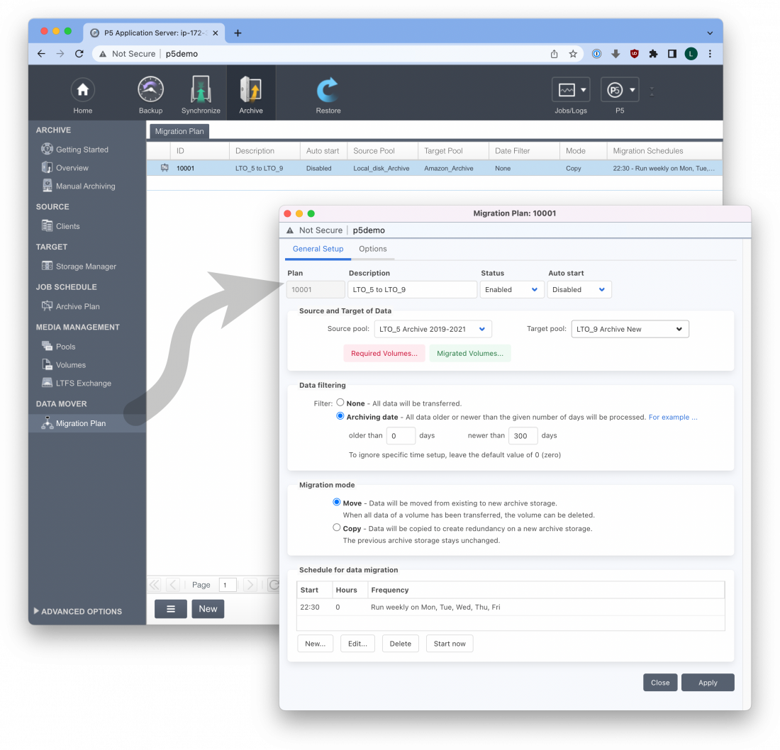 P5 Data Mover helps with the migration and maintenance of data already archived by P5 Archive. LTO tapes age and will need replacing over long periods of time. LTO tape capacities increase, making such a migration very attractive. Customers might wish to migrate some tape-based archive data to a cloud service.