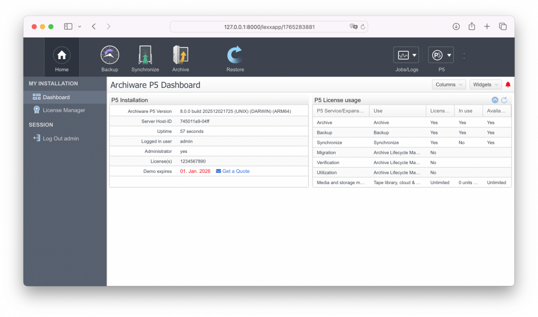 The P5 Platform is delivered as one package in a single installer that contains all modules, which are activated with a license key. This way, additional modules can by added at any point without the need for time-consuming installation. For P5 Backup and P5 Archive, the license model is based on the capacity of the tape or disk storage used as well as the number of LTO drives in libraries.