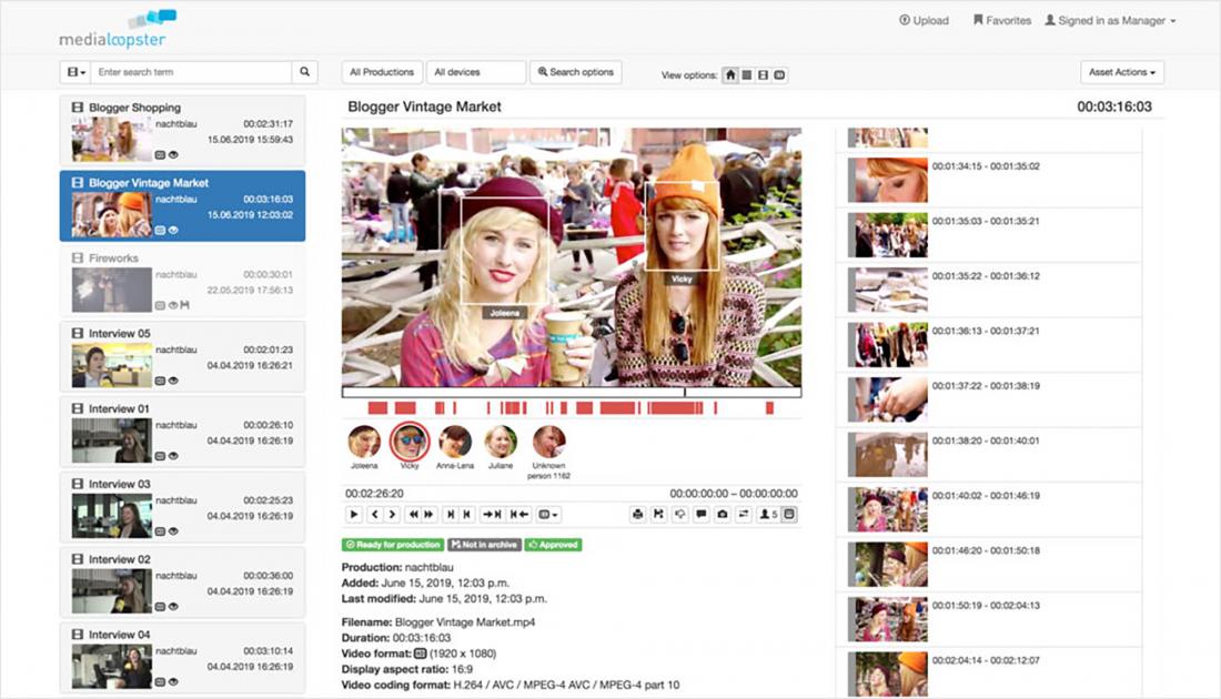 medialoopster is an easy-to-use platform facilitating the management of video assets. All workflows are efficiently managed and supported – from material acquisition, research, processing, delivery and archiving, to the analysis of existing assets using artificial intelligence (e.g. face recognition).